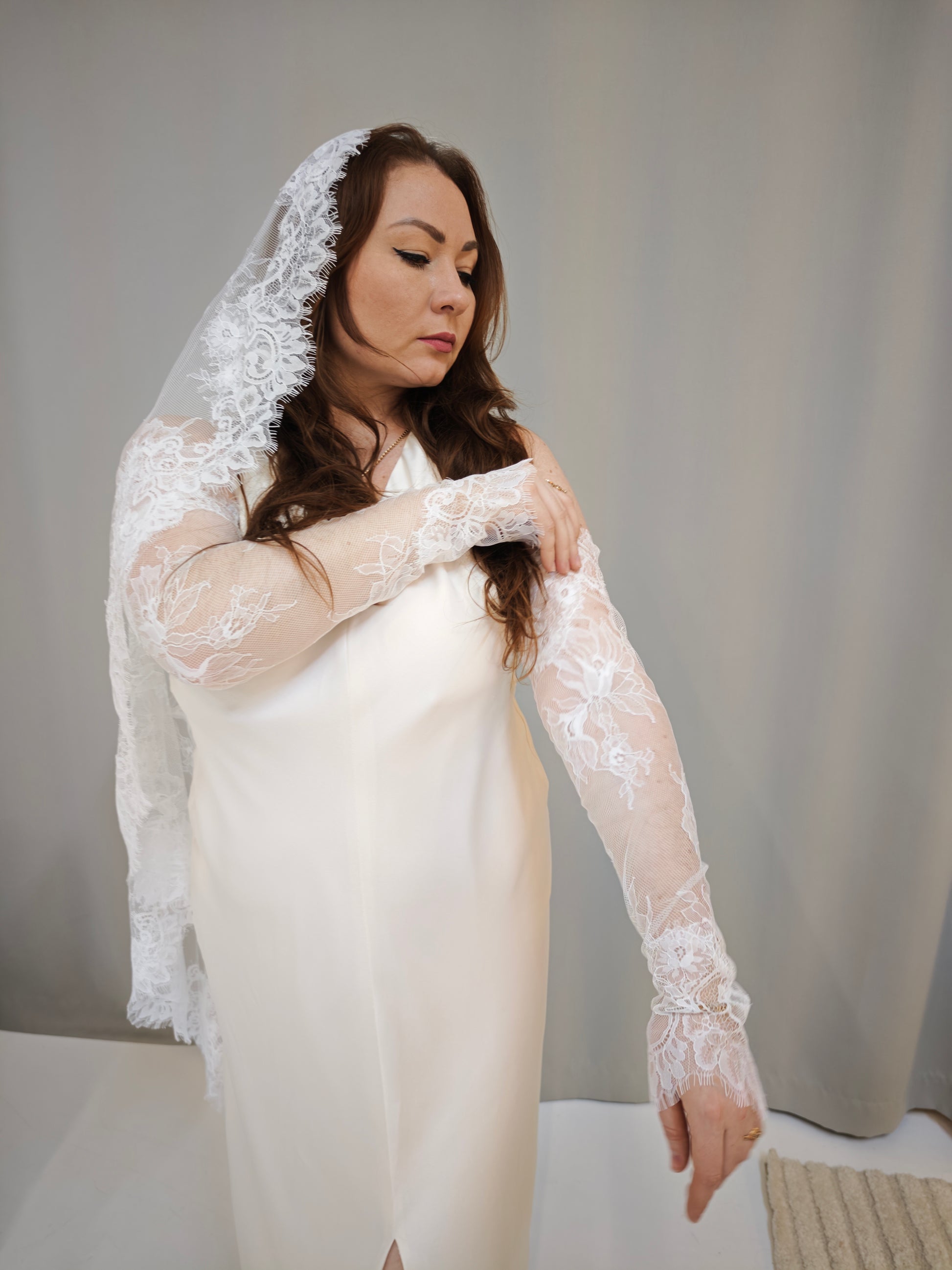 Elegant fingerless bridal gloves made from delicate Chantilly lace. Designed to softly embrace the hands and arms, these lace gloves add a refined, romantic accent to a wedding look without covering the fingers.