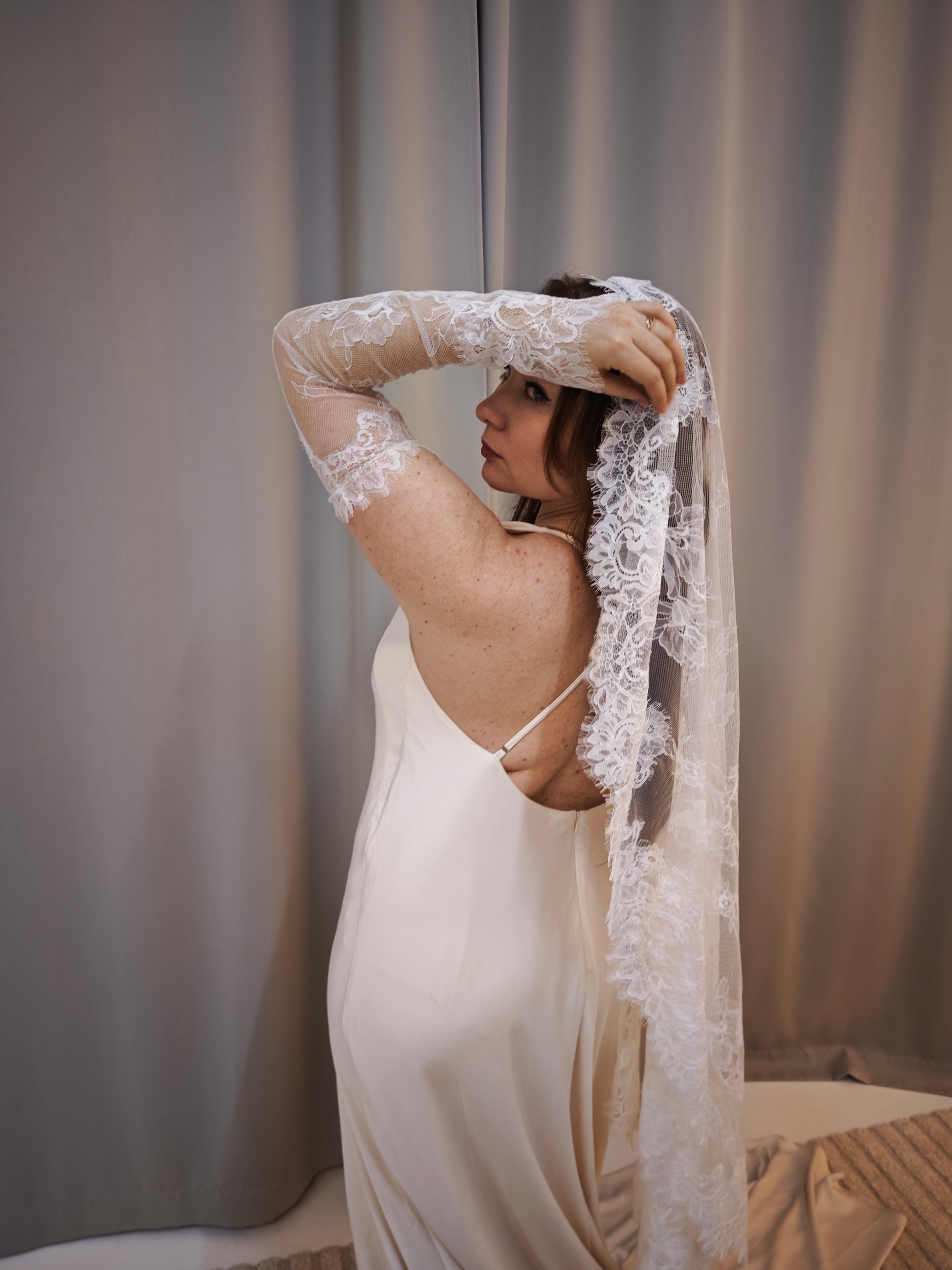 The fine floral Chantilly lace feels light and airy on the skin, allowing for comfort and freedom of movement while preserving timeless bridal elegance. Perfect for brides who appreciate subtle details and understated luxury.