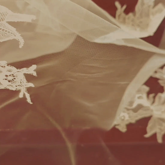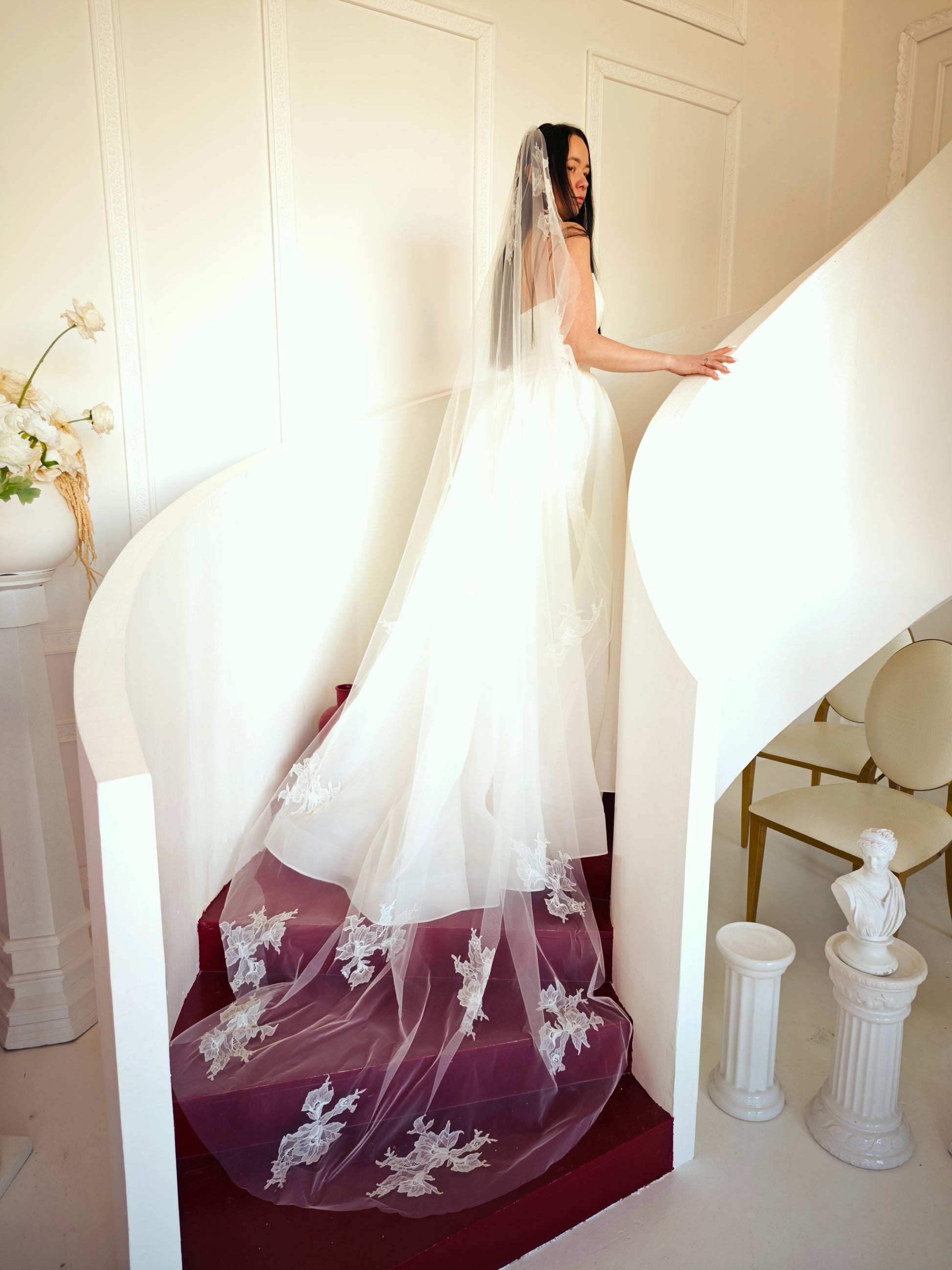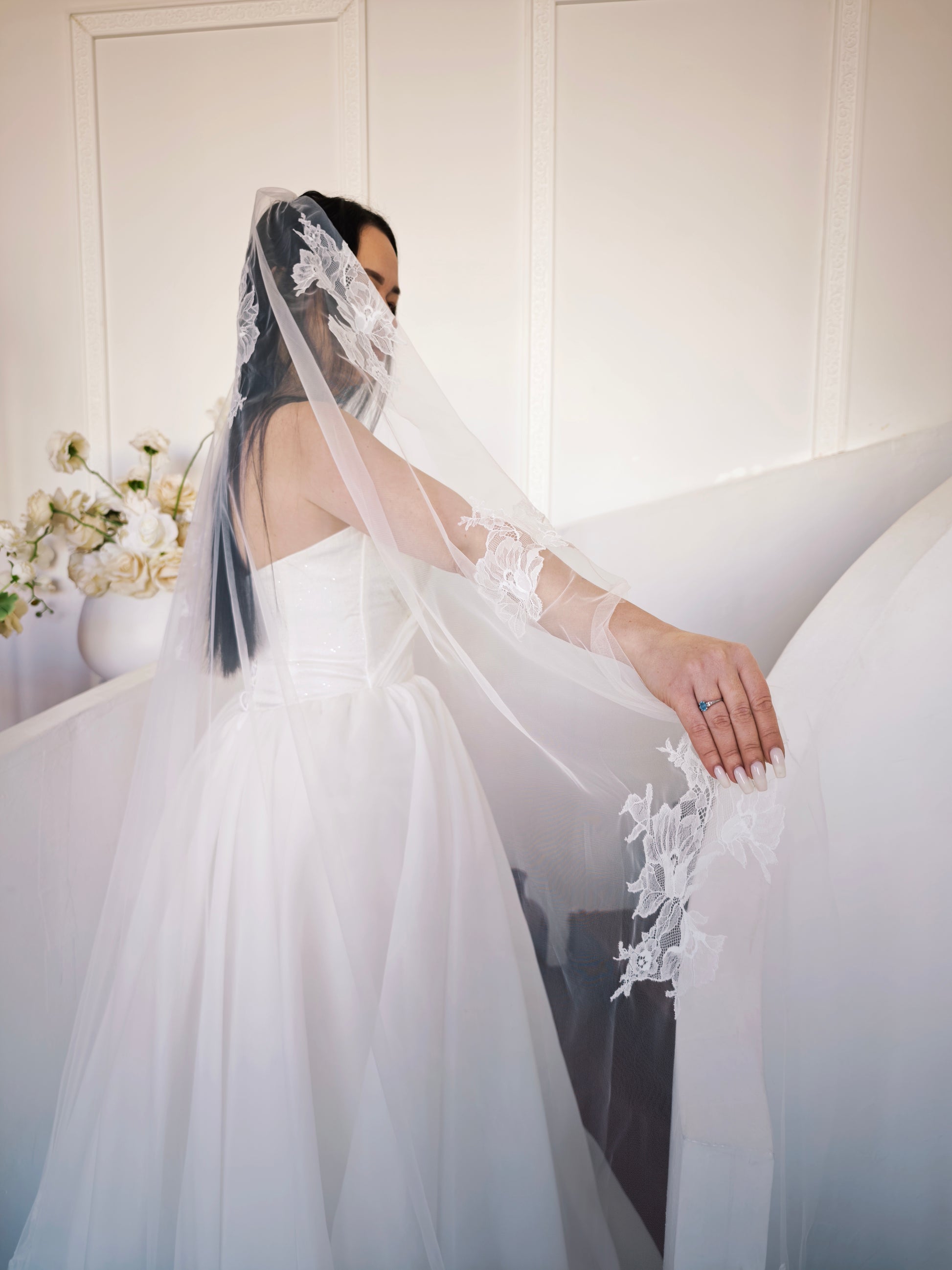 The lace gently flows along the veil, creating an ethereal, almost weightless effect that moves beautifully with every step. This veil is designed for brides who appreciate timeless elegance, quiet luxury, and meaningful details.