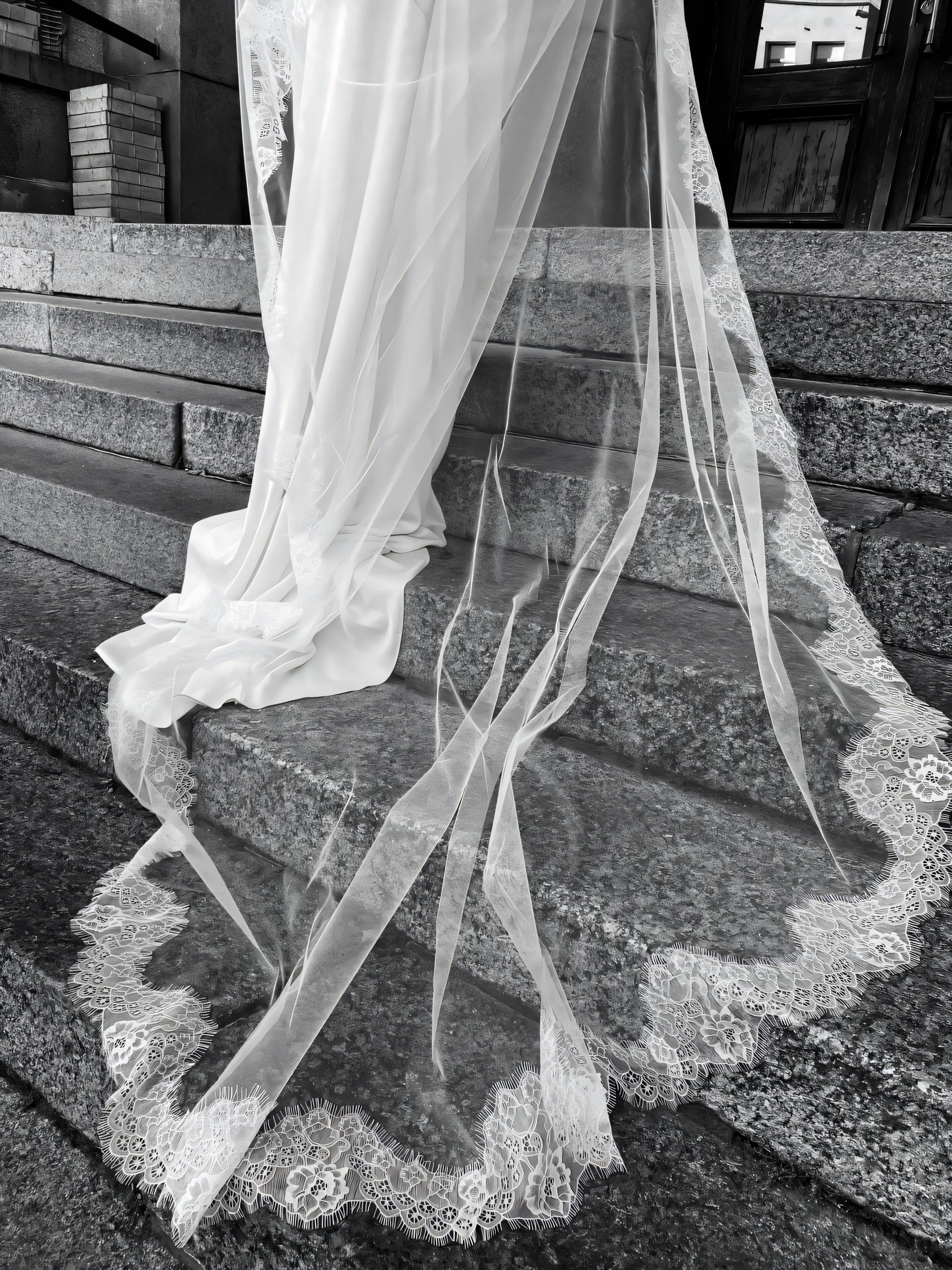 From below the fingertips, the veil is delicately finished with floral Chantilly lace, flowing gracefully toward the hem. This thoughtful placement preserves the transparency of the upper layers while adding an elegant, couture-level detail that reveals itself subtly with movement and light.