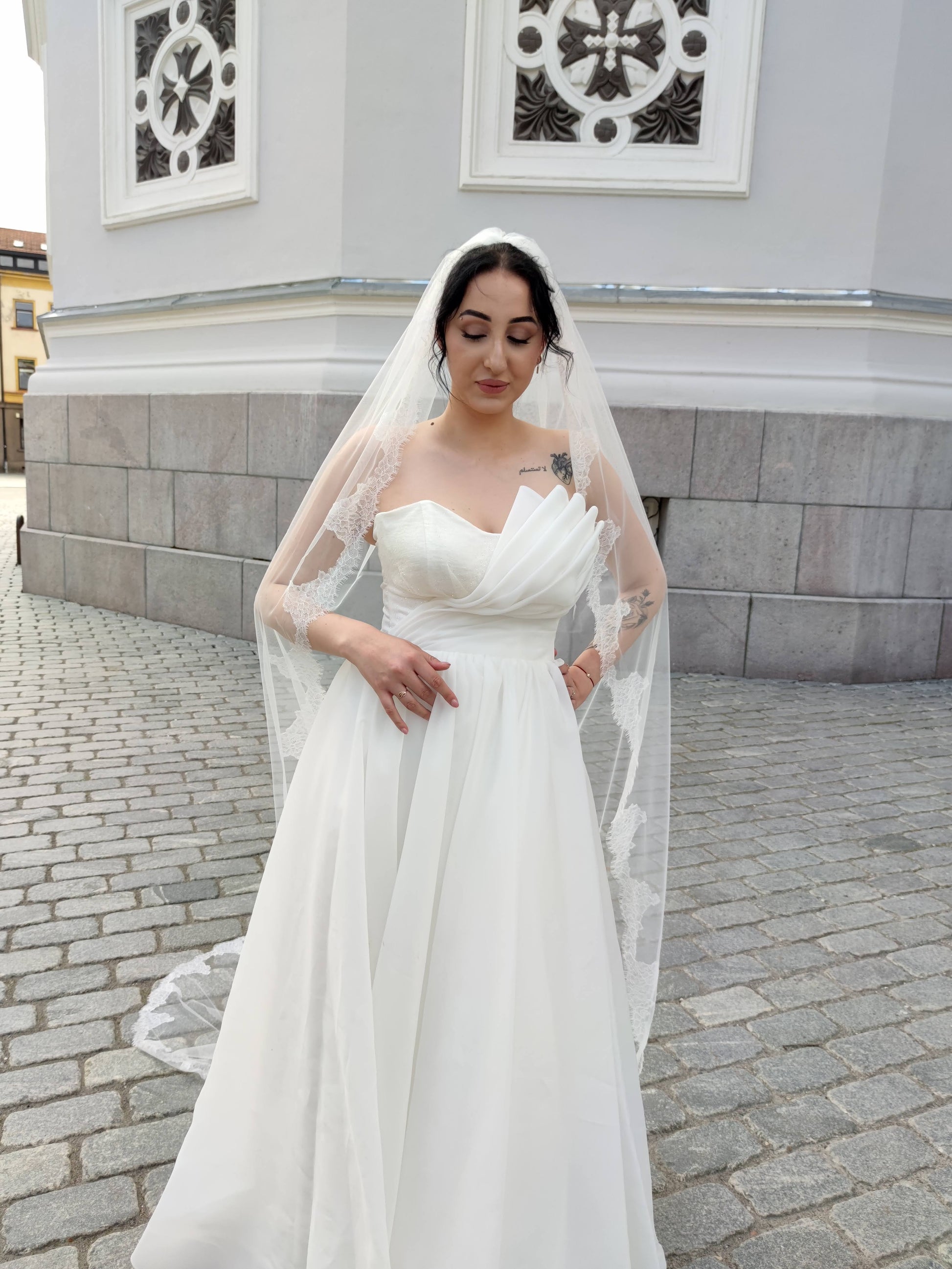 Each veil is handmade with attention to detail, offering a graceful finishing touch for a modern yet classic bridal style.